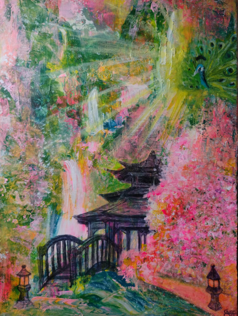 - The Asian Bridge and Pagoda: These architectural features are more than just functional; in fact, they are symbolic. The bridge represents a journey, perhaps from one state of mind to another. Similarly, the pagoda grounds the painting, offering a sense of peace and spiritual harmony.